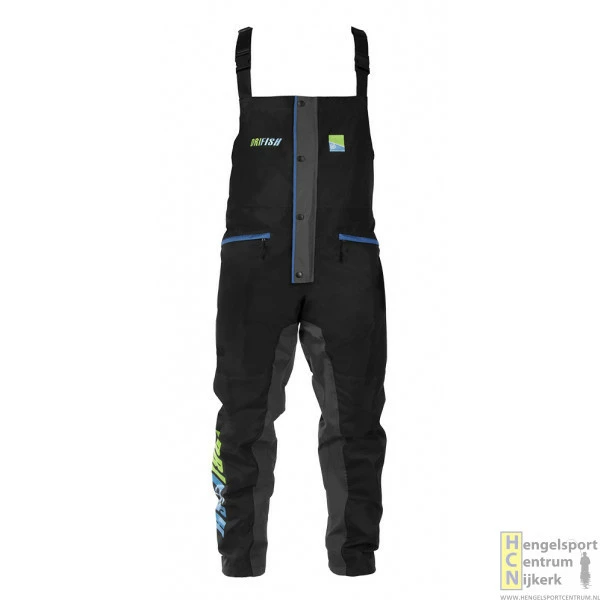 Een gloednieuwe, geüpdate versie van de voorgaande DriFish Bib & Brace, uitgevoerd in een stijlvol, lichtgewicht Grey & Black waterdicht materiaal dat perfect het gehele jaar door te gebruiken is. Dit product profiteert ook van belangrijke verbeteringen zoals versterkte gedeelten bij de knieën en in het zitgedeelte, een rekbaar gedeelte rond het middel, verstelbare riemen en een dito enkelgedeelte.